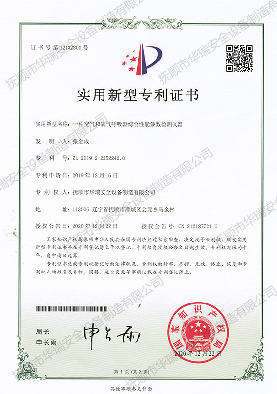 專利證書(一種空氣和氧氣呼吸器綜合性能參數(shù)檢測儀器)